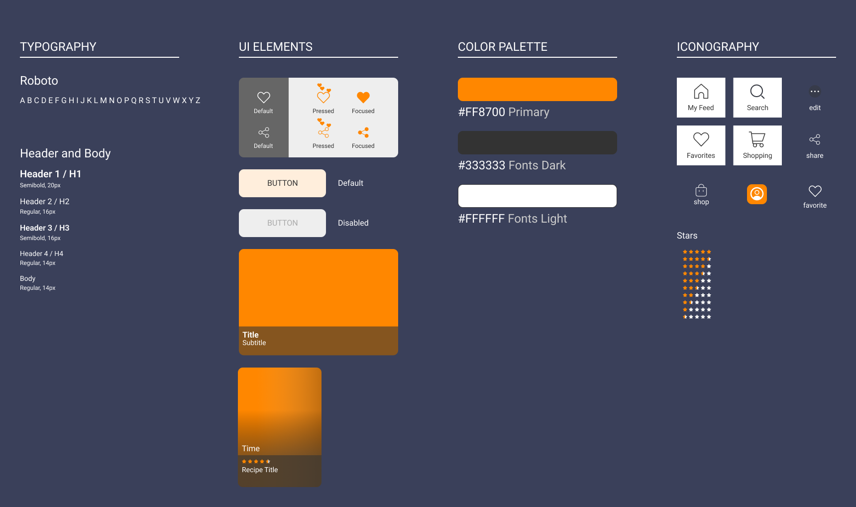 After the style guide is established, I created the high-fidelity design of the app. The aim is to give its users the ability to easily follow and discover new recipes. Daily Recommendations and recipe suggestions are displayed on the homepage. Searching for new recipes is also made easy by searching by Categories. The Recipe page is scrolled vertically which includes photos of the recipe, author, ingredients, techniques and instruction videos, and storing instructions.