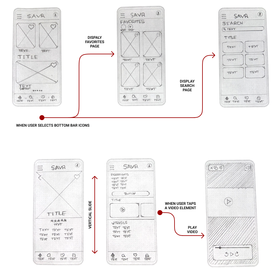Taking the sketches above, I created the following low-fidelity wireframes based on the user flow. The goal is to provide users with good size recipe thumbnails that will allow users to see what the food is.